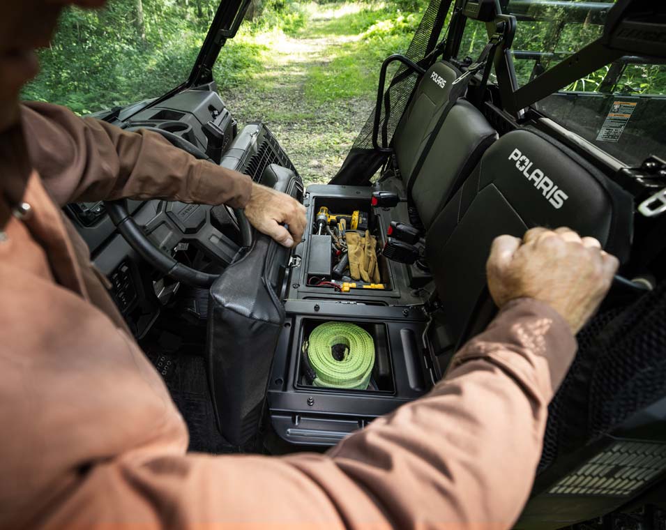 Enfréntate a un largo día off-road con un asiento súper cómodo y espacio integrado en cabina para llevar tus efectos personales.