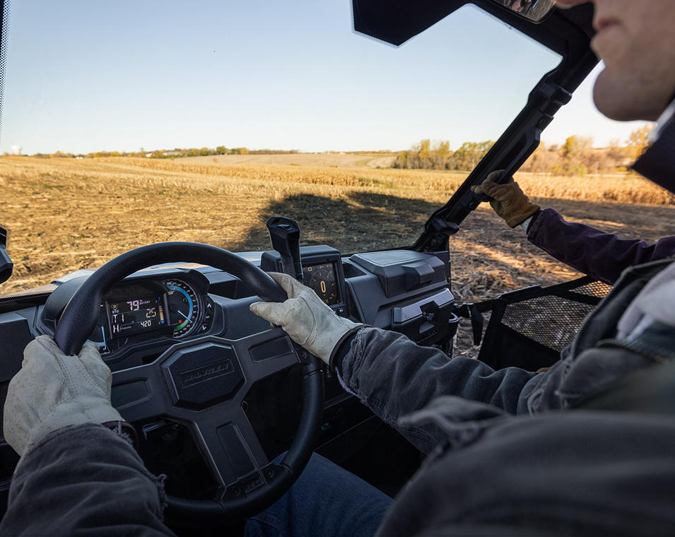 - Pantalla táctil de 7 "(accionable con guantes) con sistema infoentretenimiento EV (incluye autonomía restante, estado de carga de la batería, estado de carga, indicador de lanzamiento, diagnóstico del sistema y más), limitación de velocidad, modo pala, sistema de navegacion GPS con sistema Ride Command, temperatura del aire, Bluetooth, radio AM / FM, Cuadro con dos indicadores analógicos, con centro de información para el conductor con pantalla LCD multicolor de 4": con informacion de, uso de energía y regeneración %, estado de carga de la batería %, autonomía restante, evaluacion de carga, temperatura de la batería, temperatura del motor, voltaje de los accesorios, velocímetro, odómetro, cuentakilómetros, indicador de marcha, indicador de servicio y códigos, intervalos de servicio programables, recordatorio del cinturón de seguridad, iluminación de fondo y brillo seleccionables por el usuario, Asientos premium con respaldos contorneados y logo Polaris bordado, volante premium y detalles interiores, sistema eléctrico Polaris Pulse (6 posiciones) para accesorios, toma de corrientee DC, puerto USB doble, caja de carga con puerto SAE de 12 V con interruptor de encendido / apagado en el tablero, altavoces integrados, cámara trasera, *conectividad con la +App Ride Command